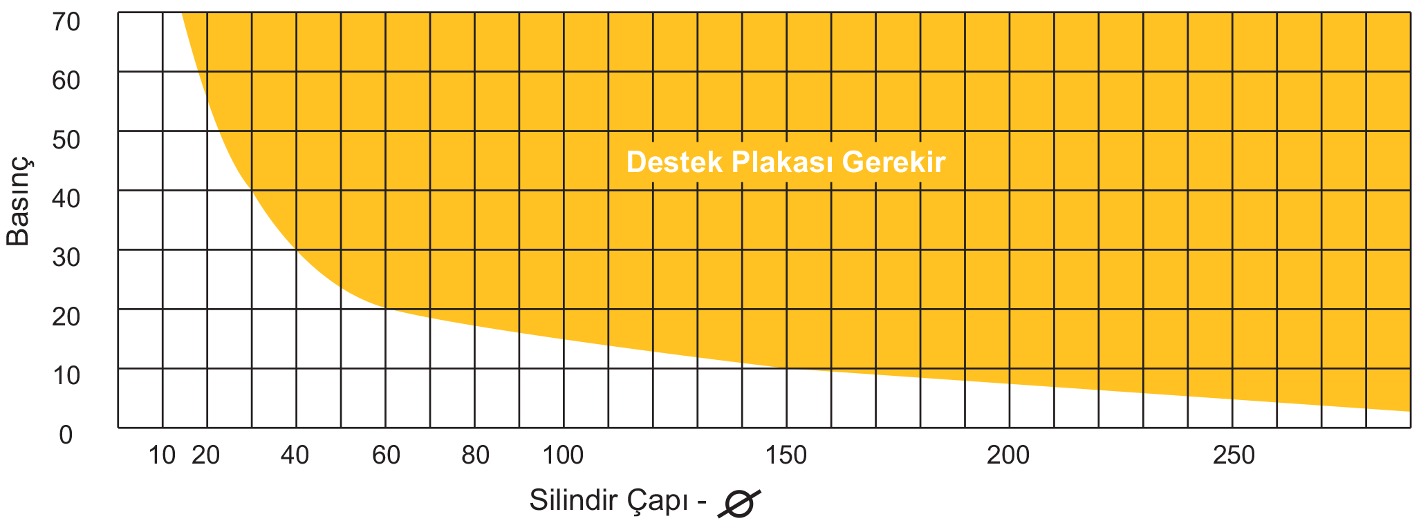 Piston keçelerinde çap büyüdükçe basınca dayanım azalır. Böyle durumlarda keçe destek plakası ile takviye edilmelidir. Pnömatik keçelerde 1 m/sn'ye kadar, hidrolik keçelerde ise 0.5 m/sn'ye kadar piston hızları normaldir. Aşağıdaki çizelgede eğrinin üstüne tekabül eden basınç sistemlerinde destek plakası gerekir.